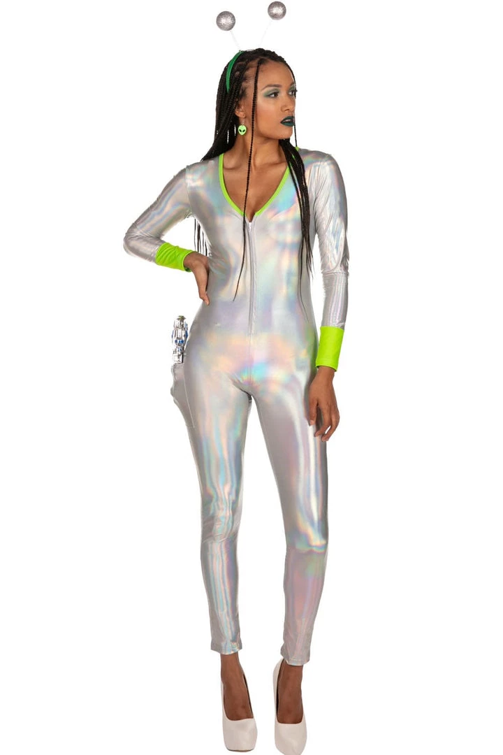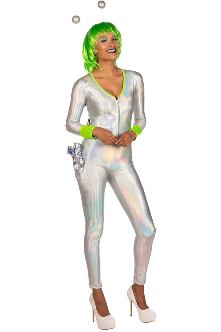 Need a Halloween costume that’s totally out of this world? We hear ya. That’s why we’ve created this Women’s Alien costume, making you look straight-up intergalactic fantastic. Make your entrance in your spaceship and dazzle your fellow party goers with this uber neon, reflective one-piece. It’s part extra-terrestrial, part disco, and full funky. With bright green sleeves and collars, you’ll stand out among the ghouls and zombies. They might be from another planet, but you’re from a whole different galaxy, honey. Having a bad hair day? Fret not, little Area 51 dweller – you can cover it all up with the green wig and antennae. It’s all included, and no alien would leave the space station without it. Feel free to add your own finishing touches from our accessories collection, like disco ball earrings to liven up the party! Who knew aliens had such awesome moves? Beam yourself up to dance floor queen status.