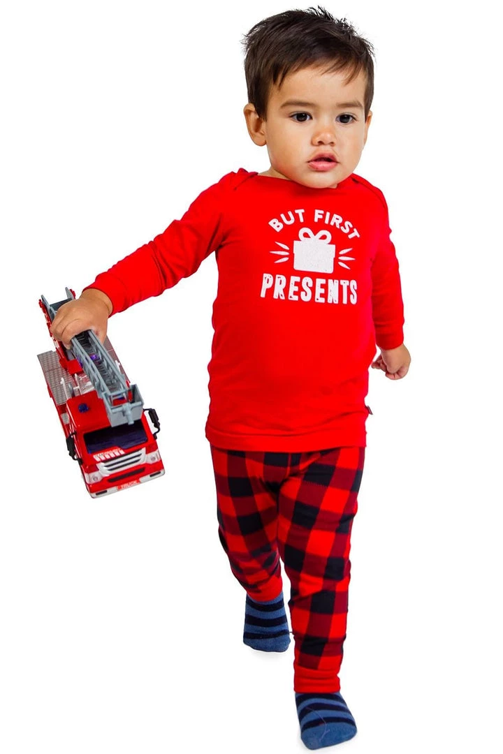 When you’re a baby, what exactly are your priorities? Naps? Food? Making sure your poop your diaper right after Mama has changed it? All of that goes out the window when it comes to Christmas time. This December, your baby’s only priority will be presents. Sing it loud and proud with our Baby But First Presents pajamas. This super cute two-piece features a gift motif with a cheeky slogan that will make even the biggest scrooges swoon. And, you know, hopefully it will encourage Grandma to write a check. Dress ’em up and laugh yourself all the way to the bank.