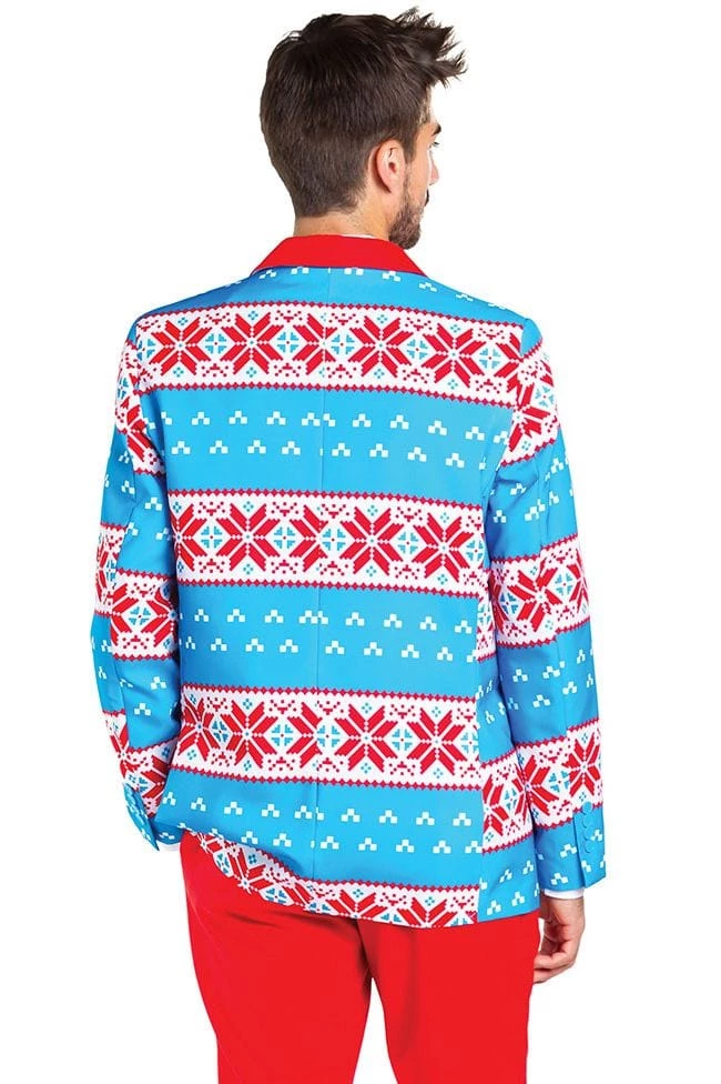 Are you in line for a promotion, but just can’t seem to get this boss’ attention? This holiday season, turn heads throughout the office with our “Blizzard Baller” Blazer. Nailing the classic chilly formal suit look, this men’s red and blue Christmas suit blazer features a Fair Isle-inspired design combo of multi-colored snowflakes. If your boss is being too hot and cold with you, give him or her a taste of their own medicine with these contrasting colors – you’ll look cool enough to impress the managers, but hot enough to impress Debra in accounting. Pair with an equally loud pair of pants to really complete that Blizzard Baller look this Christmas.