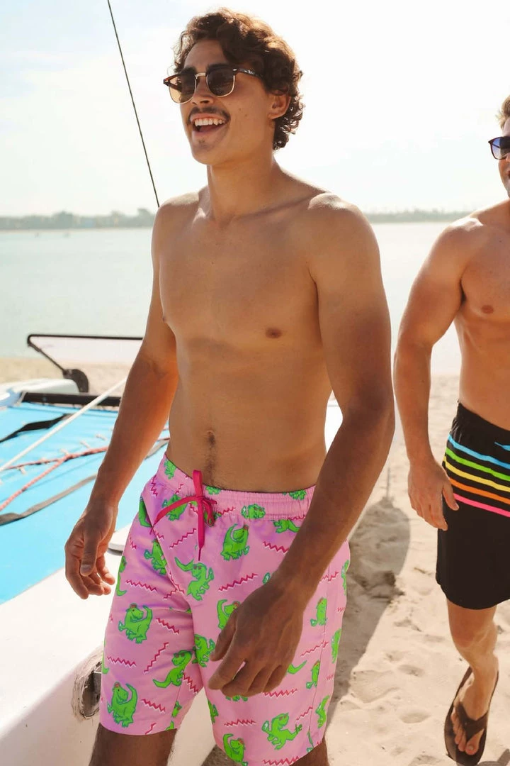 Who said disco was dead? Because it’s extinct, actually. You can be the one rad dinosaur left who’s keeping the dream alive in the Men’s Dino Disco Swim Trunks. These pink beauties with party dinos all over make the dance floor your stomping ground. They’re perfect for the sweet backflips in the pool that you’re known for. A comfy waistband with drawstring keeps your disco balls from making an appearance, and the length is just enough to give everyone Saturday Night Fever. On Sunday, no less. Slip into these and keep the dream staying alive. Staying Alive. Ah ha ha ha. Staying Alive.