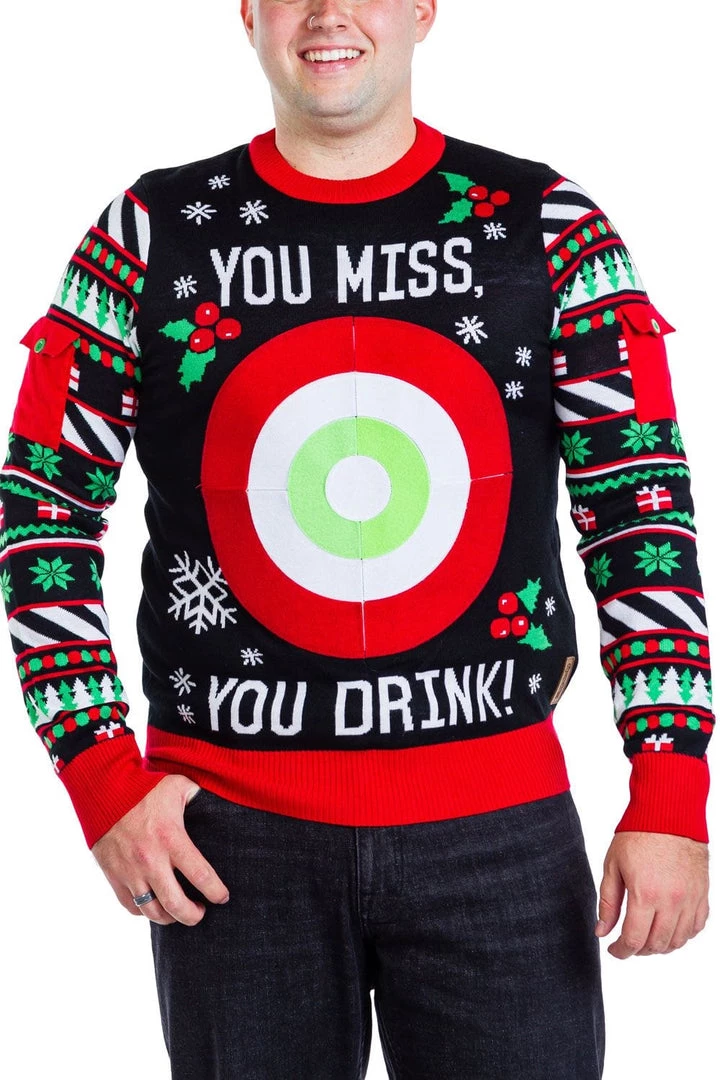 Man, this party sucks. What’s a guy got to do to find a fun Christmas party round here? We’ve got something that’s fun for all the family. Well, anybody over the age of 21. This Men’s Drinking Game Big and Tall ugly Christmas sweater will turn even the dullest of parties up to 11. With this sweater, you become the target ; ask your drinking buddies to throw the balls at the target and watch chaos ensue. If they miss, they drink. If you drink – well that could be one moving target. Y’all better get practicing.