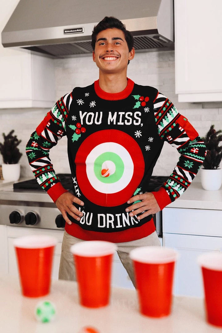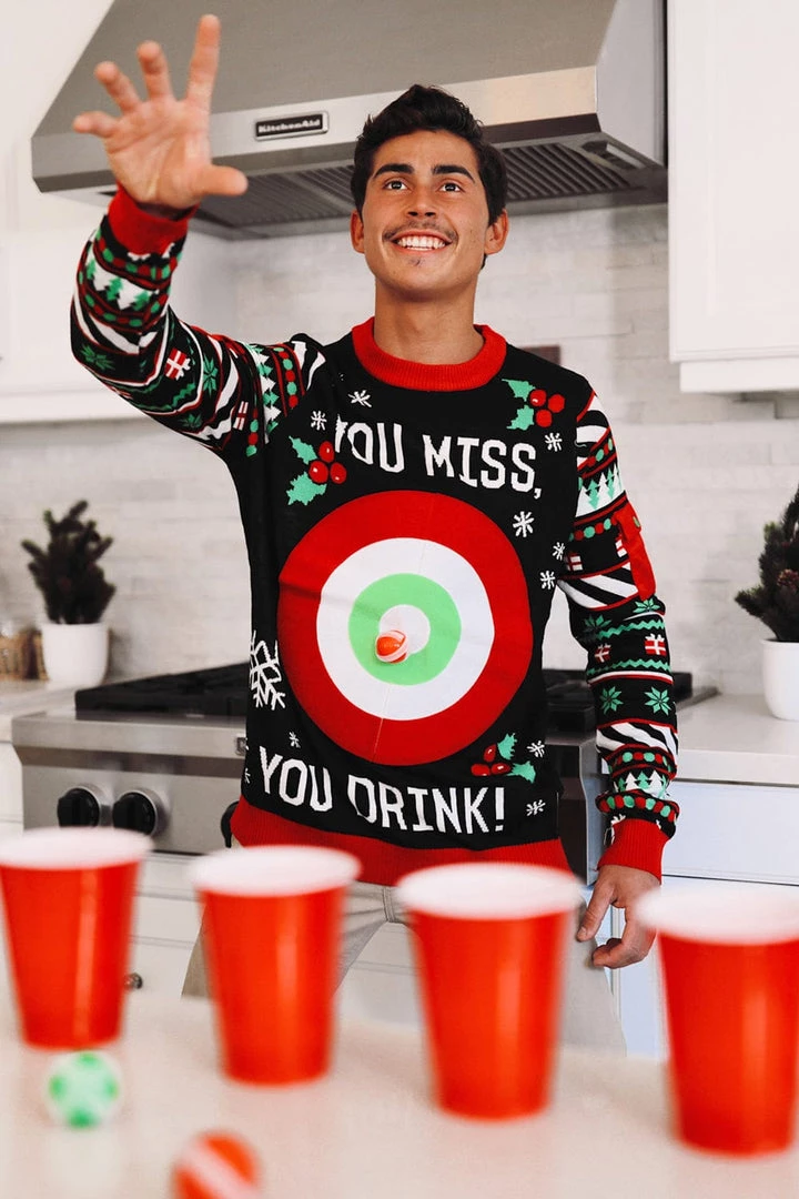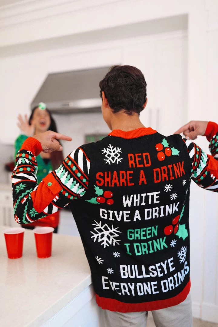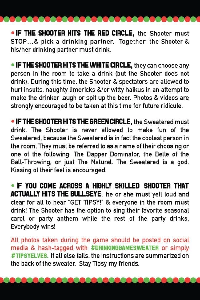This sweater isn’t just fun for the person wearing it, it’s fun for the whole party! It comes with six velcro balls that will stick to the sweater when thrown. It also comes with a rule card that will lay down the law of the Tipsy Elves Drinking Game. The target is a decent size but as the game goes on, it will become increasingly hard to hit and hopefully that means everyone is having a blast! Check out the back of the sweater for a reminder of the rules and remember to drink responsibly. See how the Drinking Game Sweater works in the video!