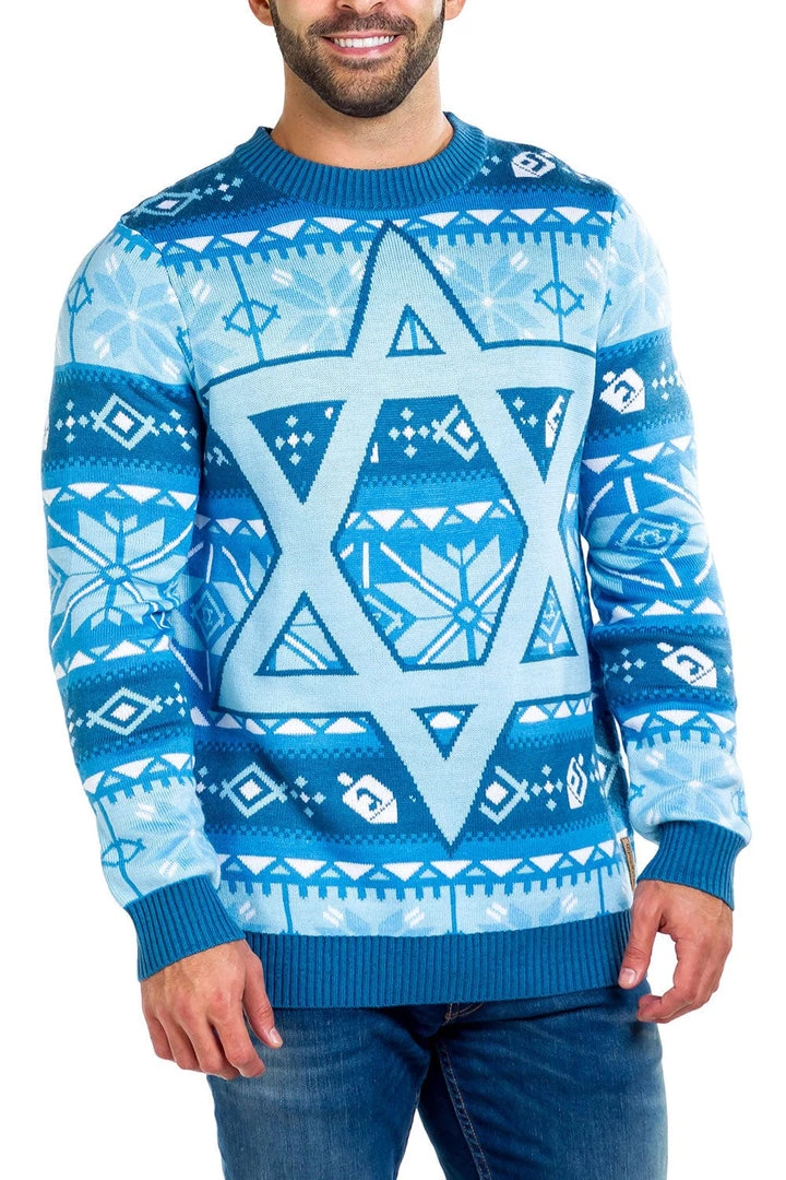 This blue Hanukkah sweater dons a large Star of David on top of a fair isle pattern.