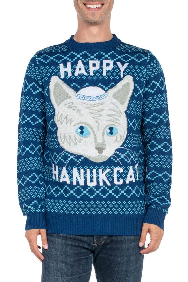 If two of your favorite things are Hanukkah and cats then this blue sweater is purrfect for you.
