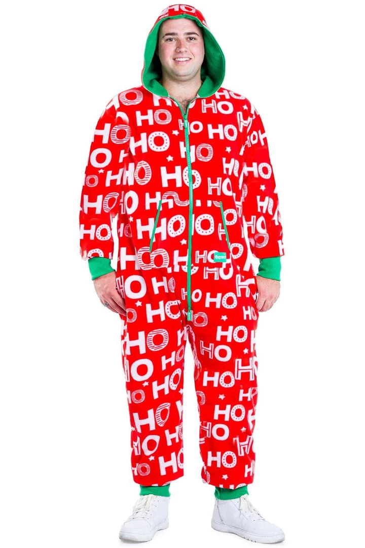 A bit louder for the ones at the back …with our Christmas wear, there’s no doubting what Santa’s favorite slogan is. Our Men’s Ho Ho Ho Big and Tall jumpsuit pays tribute to the easiest carol to remember. Who need to deck the halls with boughs of holly when you can just shout monosyllabic words? Made for guys with more to love, this jumpsuit is a classic Santa red with just a hint of Christmas tree green around the sleeves and hood. Don’t make like Santa this Christmas – it’s time to relax. Pull on this jumpsuit and chill. You deserve it.
