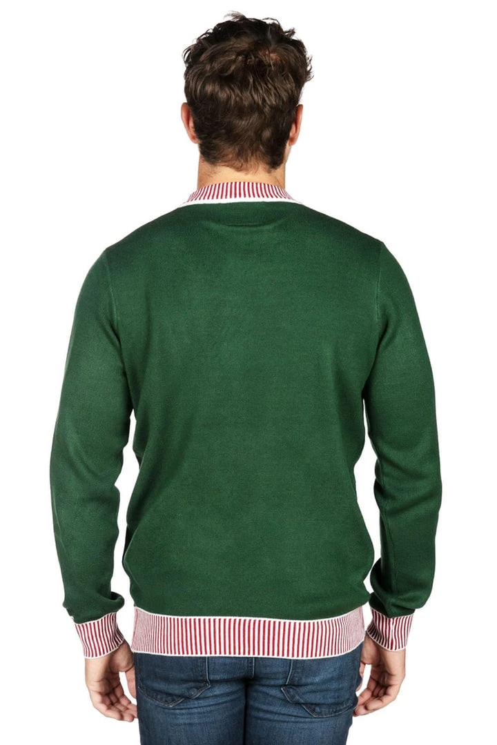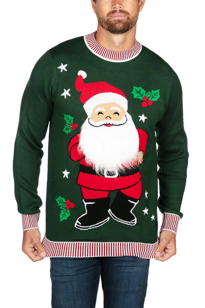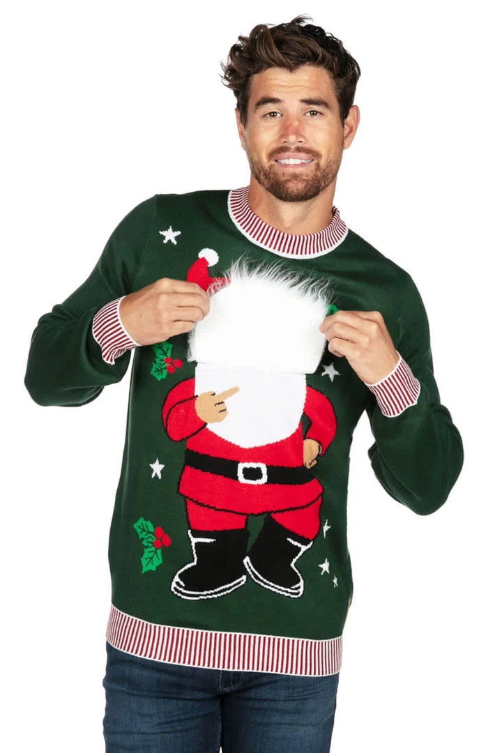 If you think this Santa appears to have an extra little twinkle in his eye and an extra spring in his step, you aren’t imagining things. You see, Ol’ Saint Nick here is harboring a bit of a dirty little secret – all you have to do is lift his beard on this Men’s It’s Flippin’ Christmas ugly Christmas sweater to reveal it in all its glory. Seems like turkey isn’t the only bird that tickles Santa’s fancy.