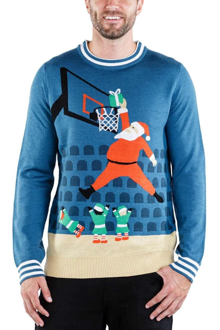 Looking for a slam dunk ugly Christmas sweater this year? Look no further. Our Men’s Jingle Baller ugly Christmas sweater will see you jumping your way to the top of the best costume list. Santa’s three feet taller than the elves playing against him, so that helps. How else do you think he trains to deliver all those presents? Show your colleagues a different side of Santa this Christmas – high on candy, spread-eagled and throwing presents everywhere. Just like you.