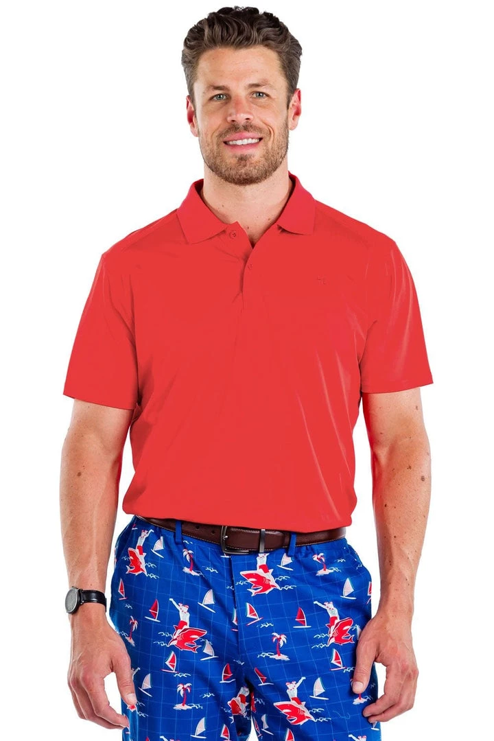 Red and green contrast so well, you should really consider making a visual statement out on the course with this vivid scarlet polo top. It’s breezy and comfortable in warm weather and goes perfectly with our American Argyle golf pants or knickers. Oh, and it looks even better with our Bloody Mary pants.