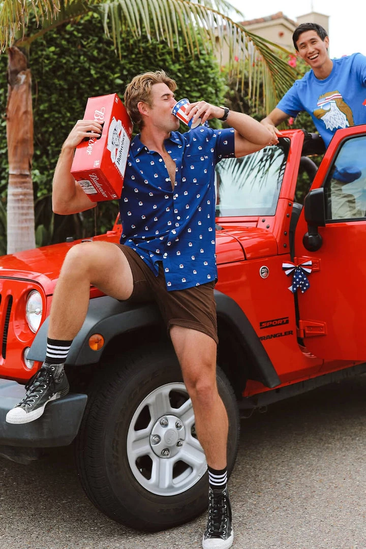Meet Steven. Steven Eagle. He doesn’t know karate and wasn’t in a bunch of awesome martial arts movies, but he’s on something better: the Men’s Regal Eagle Button Down Shirt. Wear this sucker buttoned up like a gentleman or wide open like nature intended, it’s really up to how free you want to be on the 4th of July. Undershirt optional, it’s a short sleeve button down shirt that’s all business when it comes to patriotic partying (oh yeah, and it’s got a pocket).