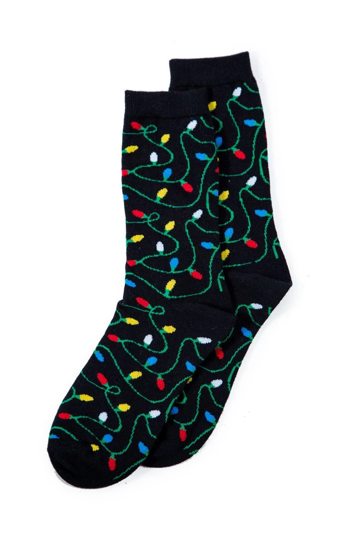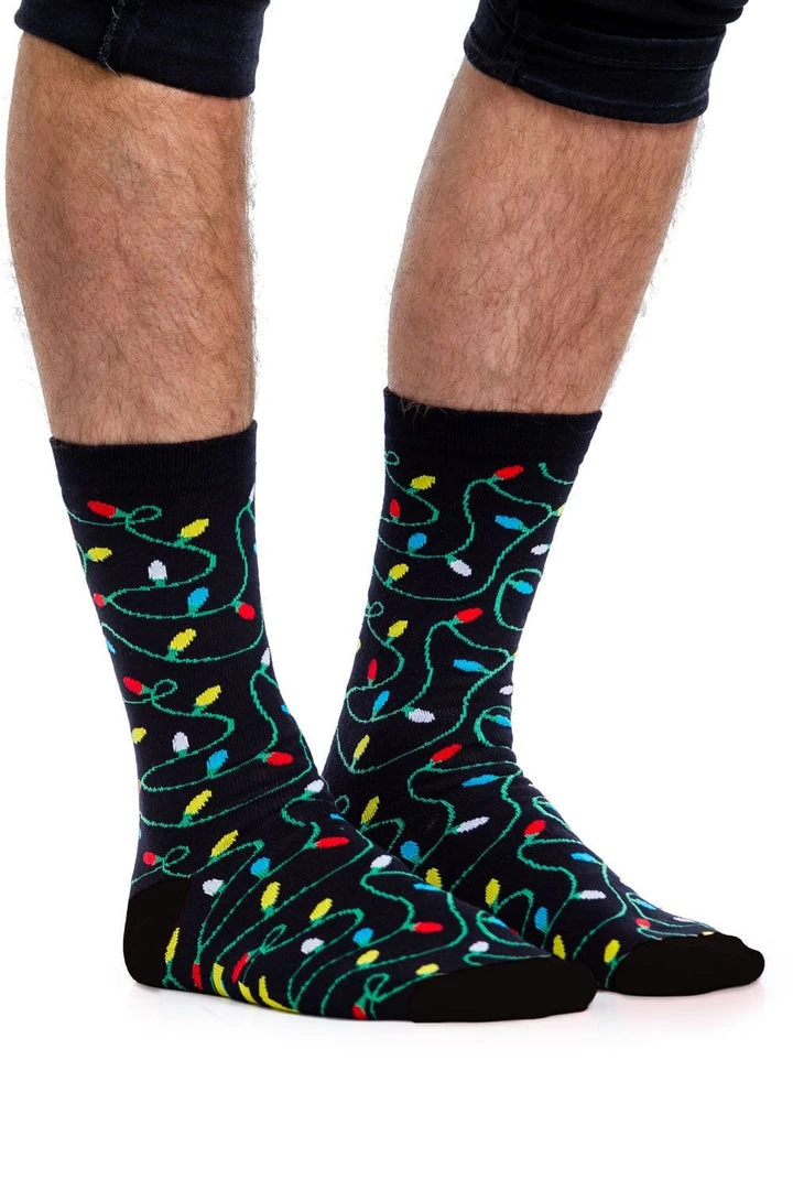 There are all sorts of hazards when it comes to hanging Christmas lights. From errant cats to disturbing the Wi-Fi, these humble lights can be more trouble than they’re worth – so how do we keep the Christmas sparkle? Wear them, of course! These Men’s Black Christmas Lights Socks bring all the magic of a Christmas tree with none of the drama. Pull them up to the knee for a warm and cozy festive accessory, ideal for running around the shops panic buying or just lounging around the house. Wear them with a pair of black tights to give your calves the attention they deserve – after all that shopping, it’s time they had some credit.