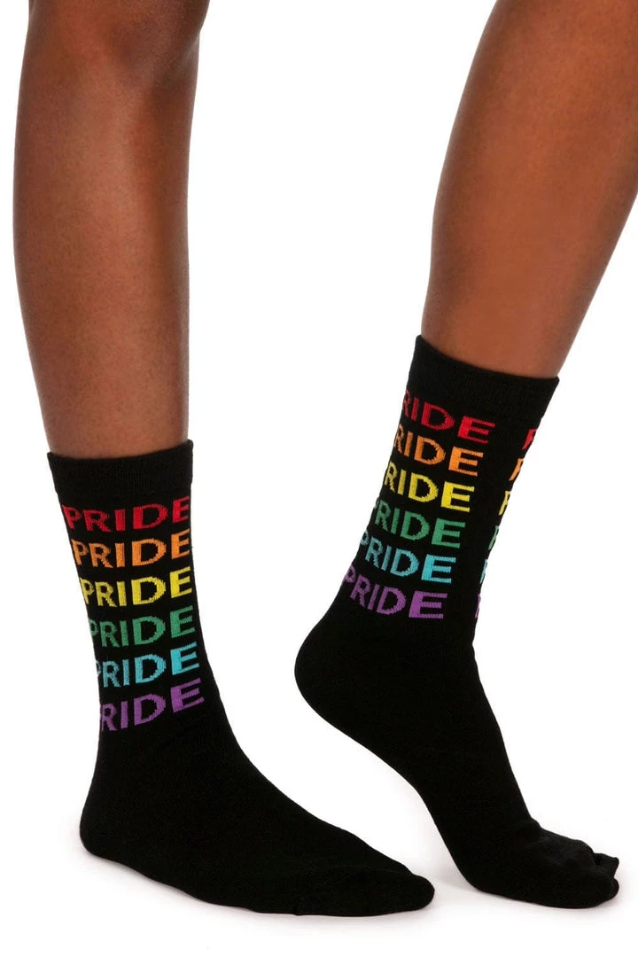 Louder for the people in the back…do we really have to say it six times? We’re here and we’re queer – but in case we’re not shouting loud enough, we’ve written it in rainbow colors down these delightful socks. Rock up to the parades with pride in these colorful tootsie warmers.