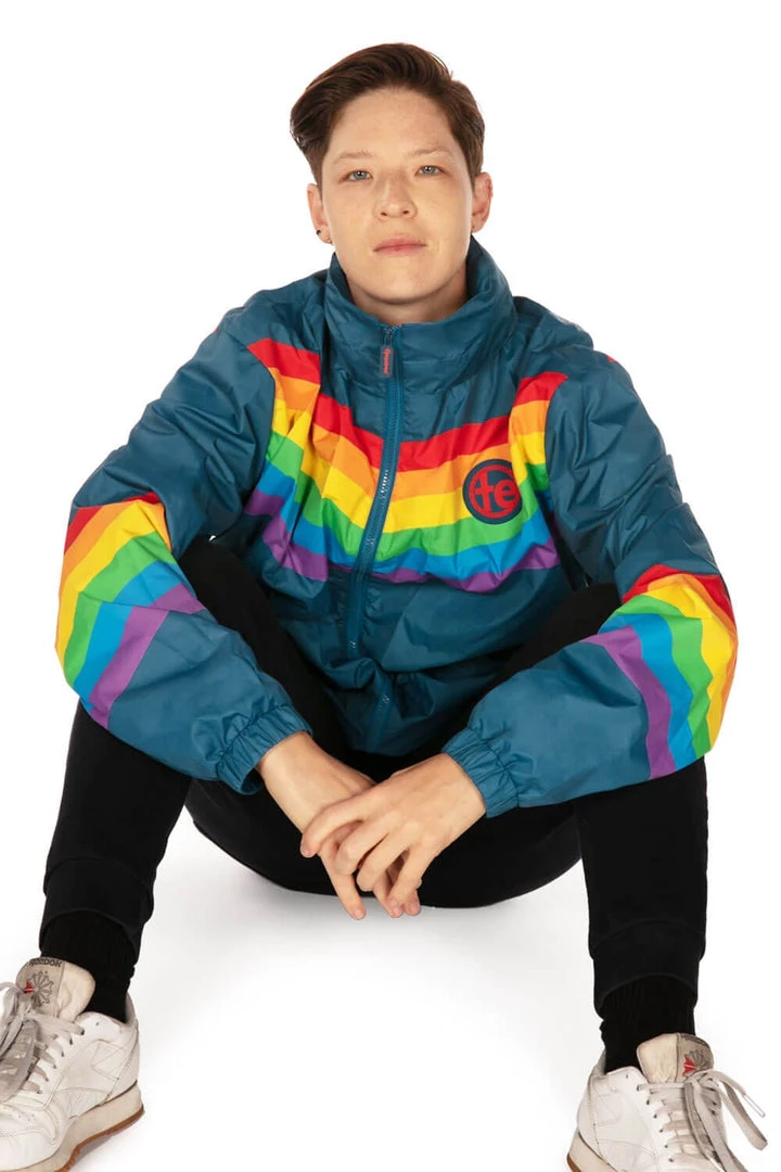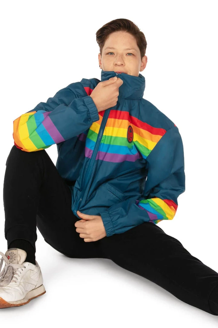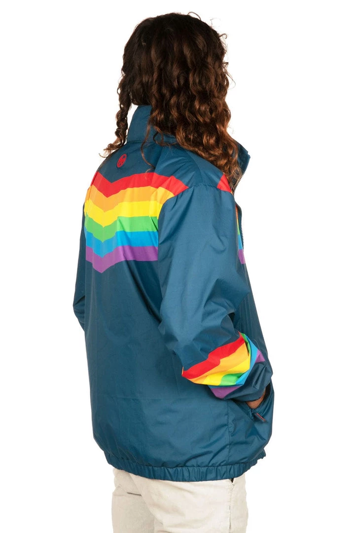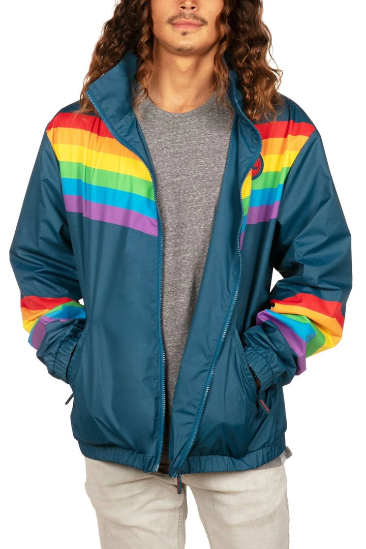 In order for there to be a rainbow, there must be, well – rain. As you wait for the sun to break through again, sport the lightweight Men’s Cut Rainglow Windbreaker Jacket to perfectly reflect the beauty after the storm. No matter the weather, the neutral blue and pop of rainbow color makes it the ideal jacket for everyday.