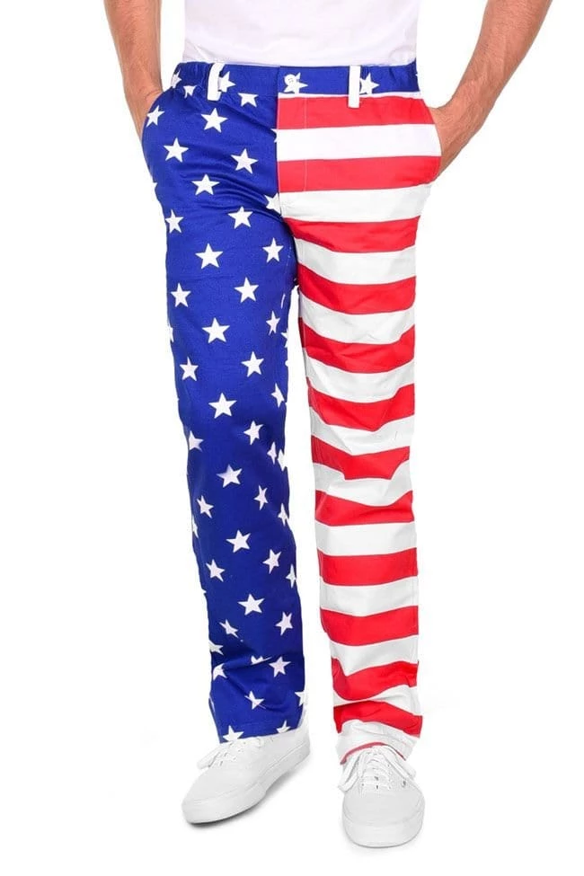 You’ll have plenty of storage space in these pants with side and back pockets. We’ve added rounded flaps to the back pockets along with buttons and a Tipsy Elves patch. The comfort fit waistband features elastic and belt loops (in a contrasting white color) so you have multiple options for keeping your trousers in place. The slim, modern cut of these pants ends in a straight leg for the perfect break at the ankle just above the hem. We recommend wearing these pants with some comfortable canvas sneakers to create a whole new fashion statement called “patriotic casual.”