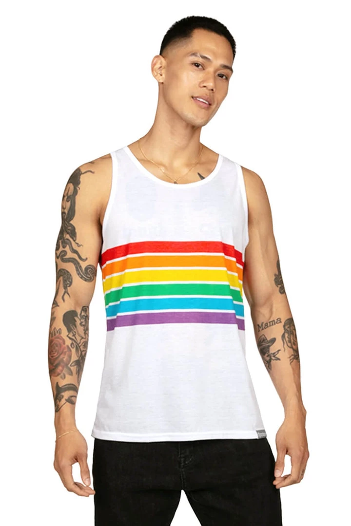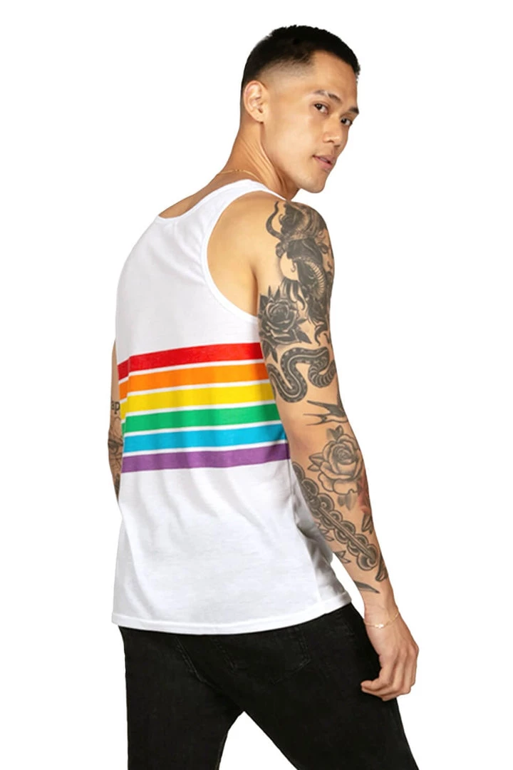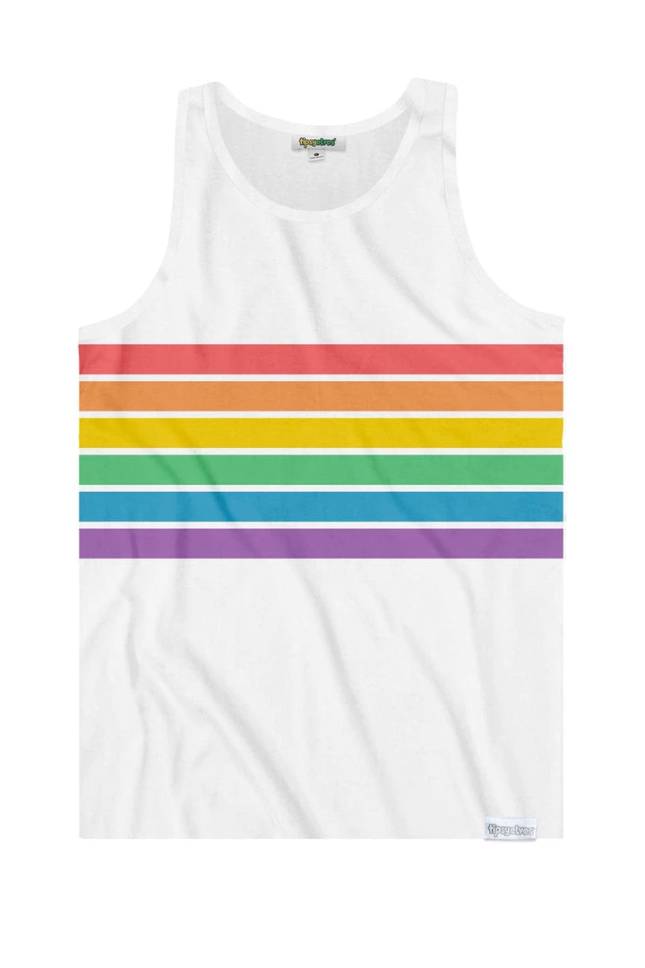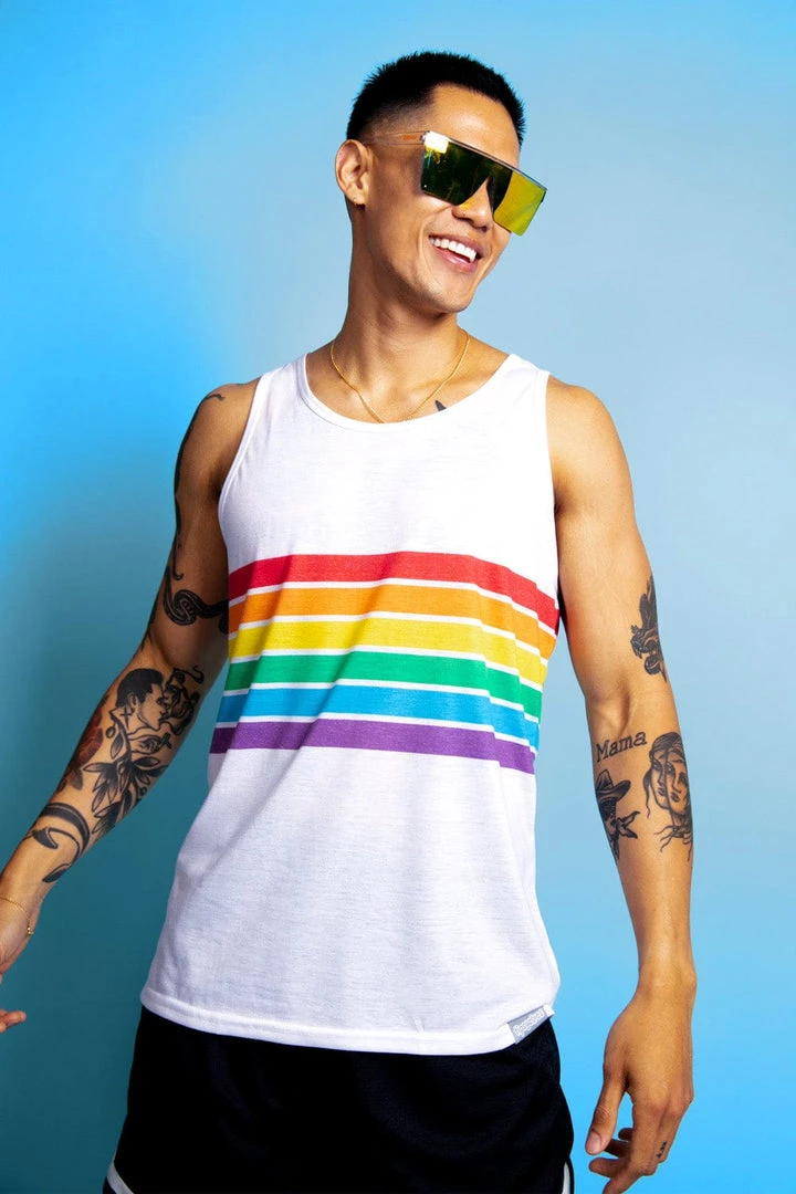 Gentlemen – looking for a fabulous Pride outfit that also doubles as a gym outfit? We’ve got it: our (Men’s) White Rainbow All the Way tank top will help you flex your guns and strut your stuff. It’s also got every color you need so it goes with everything. Wear it anywhere!