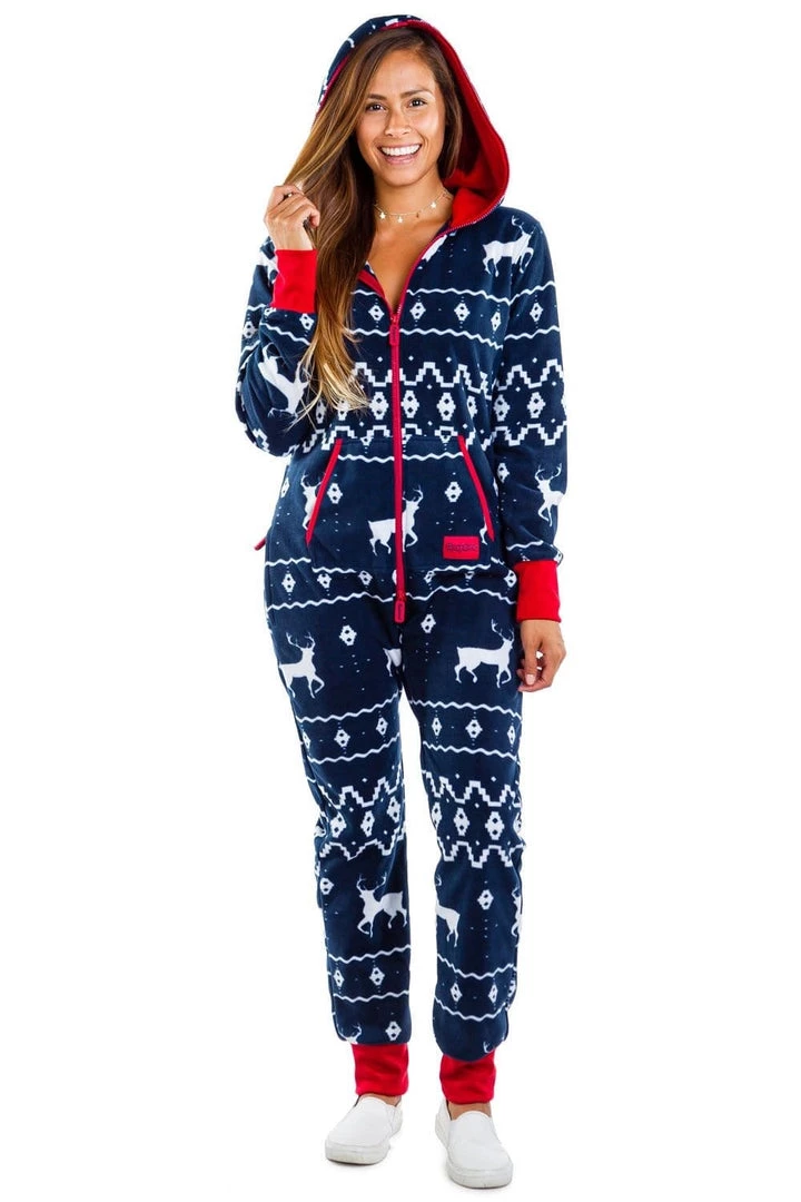 Bored with standard pajamas that everybody seems to have? This holiday inspired jumpsuit is ideal for feeling comfortable regardless of where you are or what you are doing during the holiday! The bold blue background features a white Fair Isle design complete with grazing reindeer for good measure. The front pockets include a zipper for security purposes and the Christmas jumpsuit features a holiday red accent color.