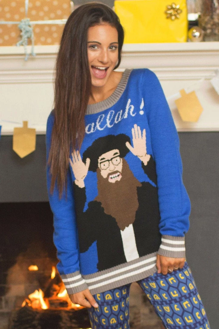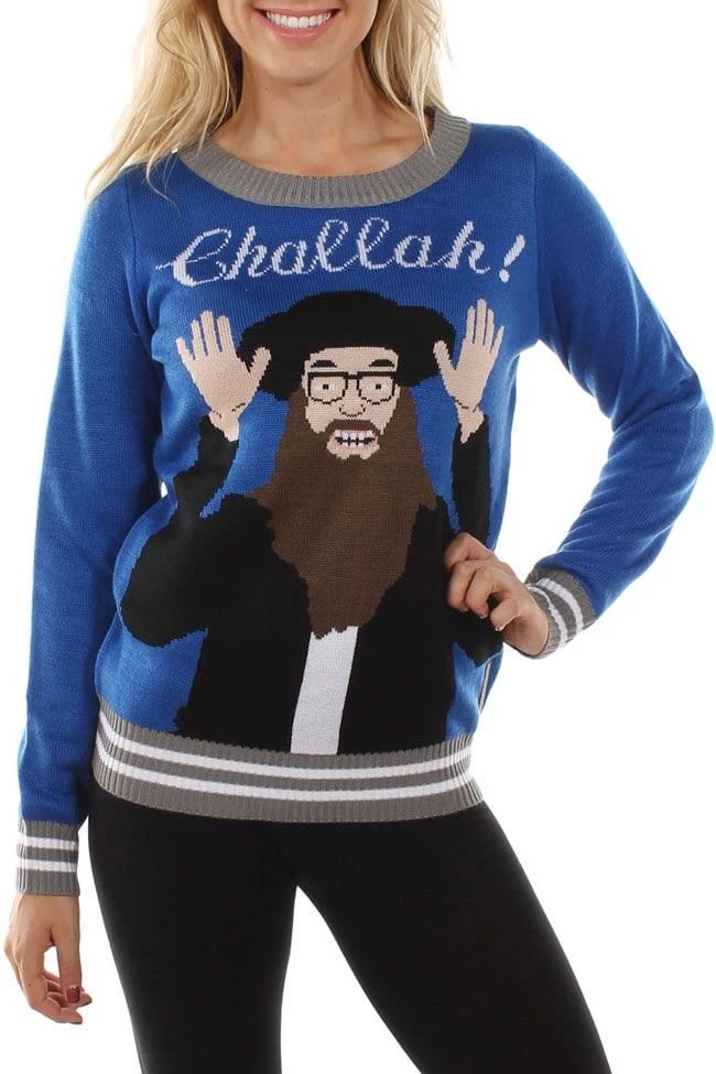 This decidedly unorthodox Hanukkah sweater celebrates the one thing that everyone can agree on-challah is delicious! The gentleman on this top is clearly overcome with the heavenly aroma of this baked delicacy. Add your own tasteful touch with by pairing this top with some wide leg gray trousers and some bright blue shoes. It’s a fashion extravaganza!