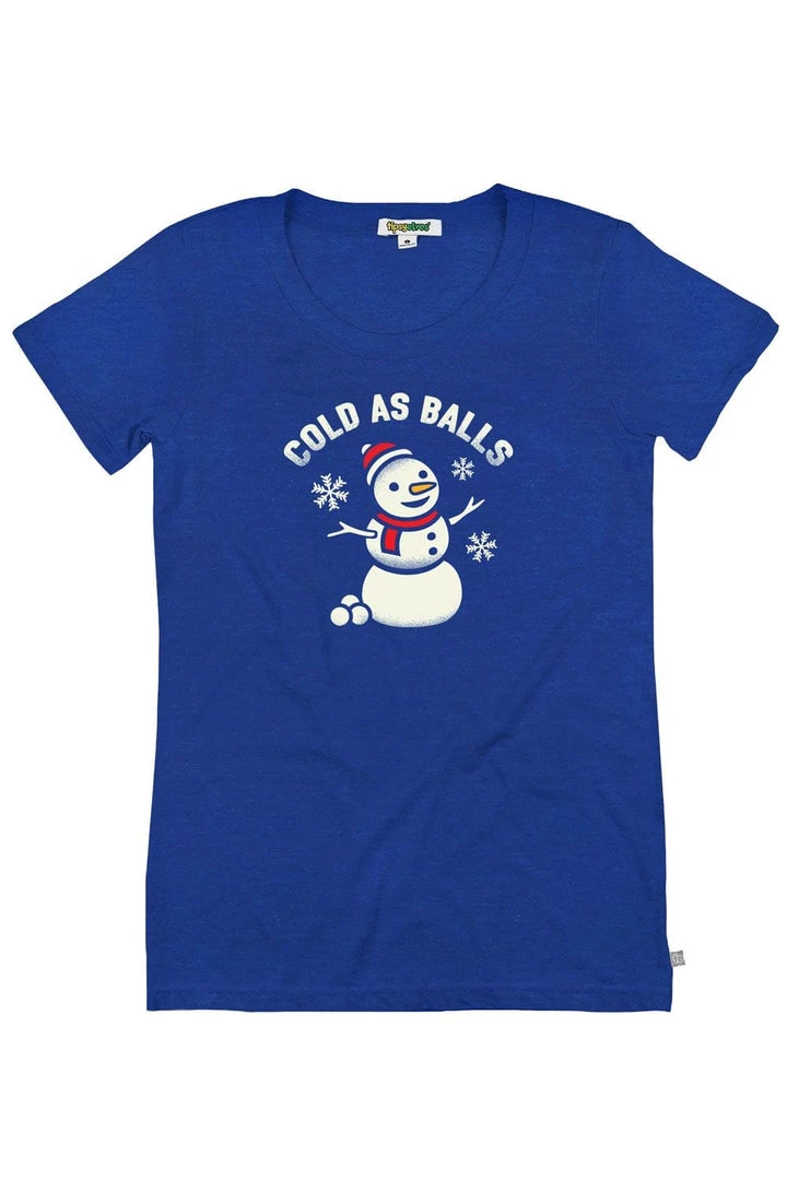 If it weren’t for the snow, we’d all have moved to the desert a long time ago. Let’s face it: being cold sucks. But throwing snowballs at unsuspecting victims never gets old. That’s why we’re celebrating the cold stuff with this Women’s Cold As Balls t-shirt. It’s got an innocent motif of Frosty the Snowman dancing under snowflakes, plus the essential tongue-in-cheek slogan. Little Frosty’s even managed to rustle up some snowballs for us. And people say he is so cold-hearted. Brighten up the office with this cheeky motif – just buy a cardigan if it really is that cold outside.