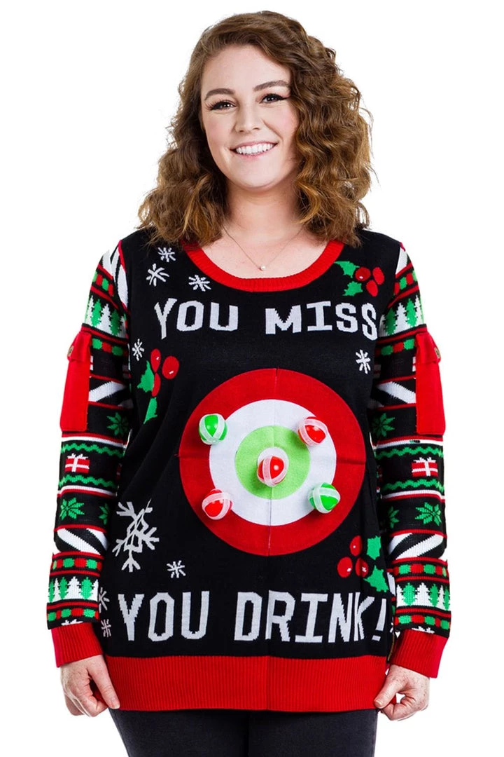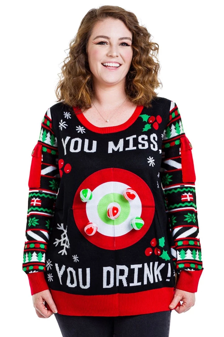 You miss, you drink! That’s a pretty simple set of rules, right? We’re here to liven up any boring Christmas parties you might be subjected to this year. Introducing the Women’s Drinking Game plus size ugly Christmas sweater. All you have to do is pull on this snuggly sweater and brace yourself. You buddies can throw the soft balls at the target, and whoever misses, drinks! Save this one for office parties – probably safer to break the photocopier than Mom’s good china. With festive colors and a healthy dose of irresponsible drinking, this is both stylish and good old-fashioned fun.