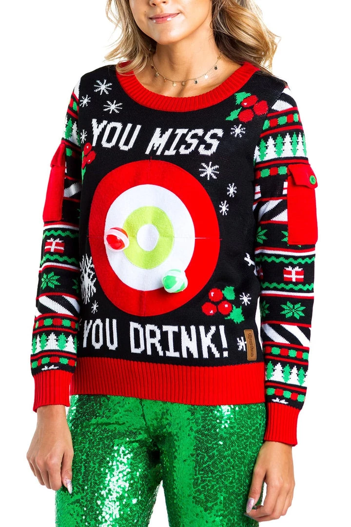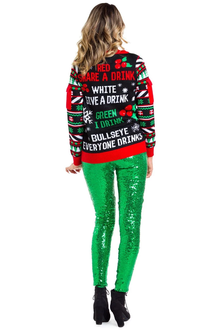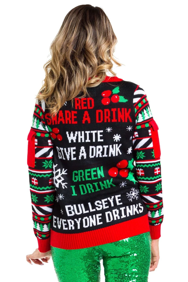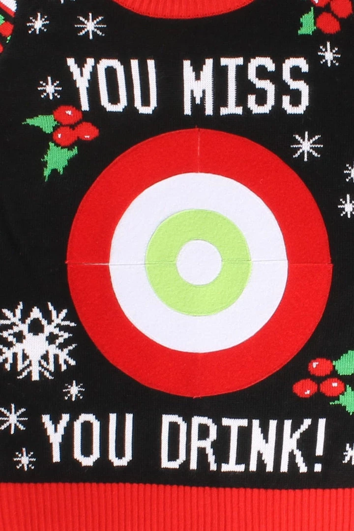 This drinking game sweater does not just provide holiday fun for the person wearing it, it’s fun for the whole entire Christmas party! This holiday sweater includes 6 velcro balls stick to the sweater when thrown at the target. It also includes a detailed rule card that will lay down the law of the Tipsy Elves Drinking Game. As the game goes on, the target and especially the bullseye will become more and more difficult to hit and hopefully that results with everybody having a grand time! Peek at the back of the sweater for a reminder of the rules and, as always, remember to drink responsibly. See how the Drinking Game Sweater works in the video!