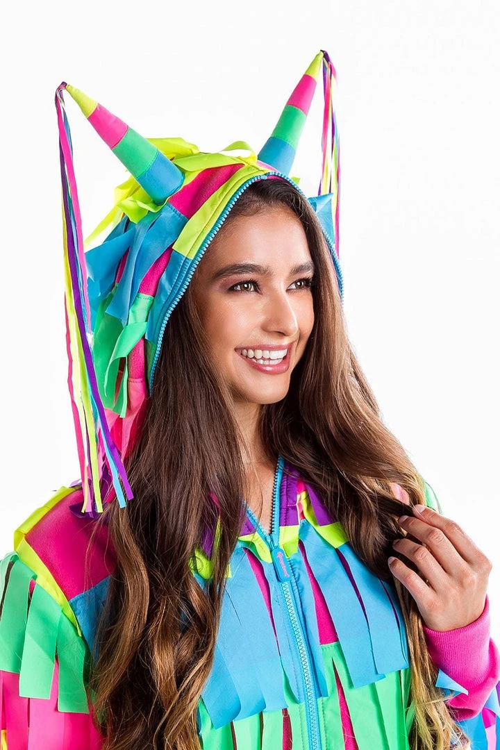 Providing a fresh new take on horse outfits, this Halloween pinata costume will certainly break the ice at your next Halloween party. While you can’t promise your guests you’ll be full of candy, you can give them something to talk about with this hilarious women’s pinata costume. Don’t be fooled by the reams and reams of multi-colored strands – this adult pinata costume is as practical as it is crazy. There’s plenty of freedom of movement for strutting your stuff, and the floppy hood is a great excuse to cover up a bad hair day. Choose the Halloween pinata costume if you want something a little different from the dark and ghoulish outfits we’re so used to seeing. It’s super comfortable for lounging around the house, and so colorful it can be seen for miles – perfect for trick or treaters. Just make sure you keep away from anybody yielding a bat.