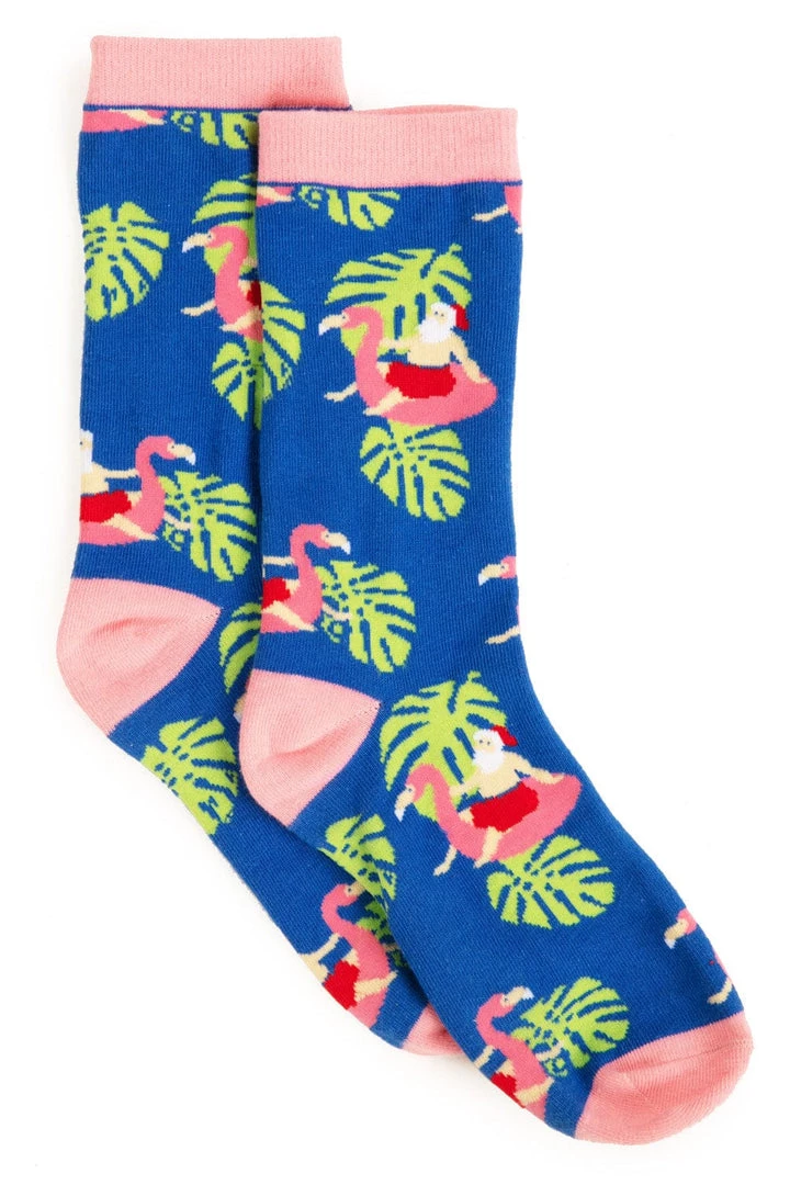 Santa has breaks too, you know. Make like the big guy and kick your feet up with these Women’s Santa Pool Party socks. There’s not a hint of Christmas tradition in sight – rather, the big guy floatin around on flamingos. Be as unconventional as your footwear in these super toasty cotton socks. Earn your place on that nice’ list.