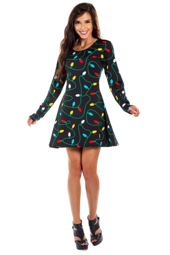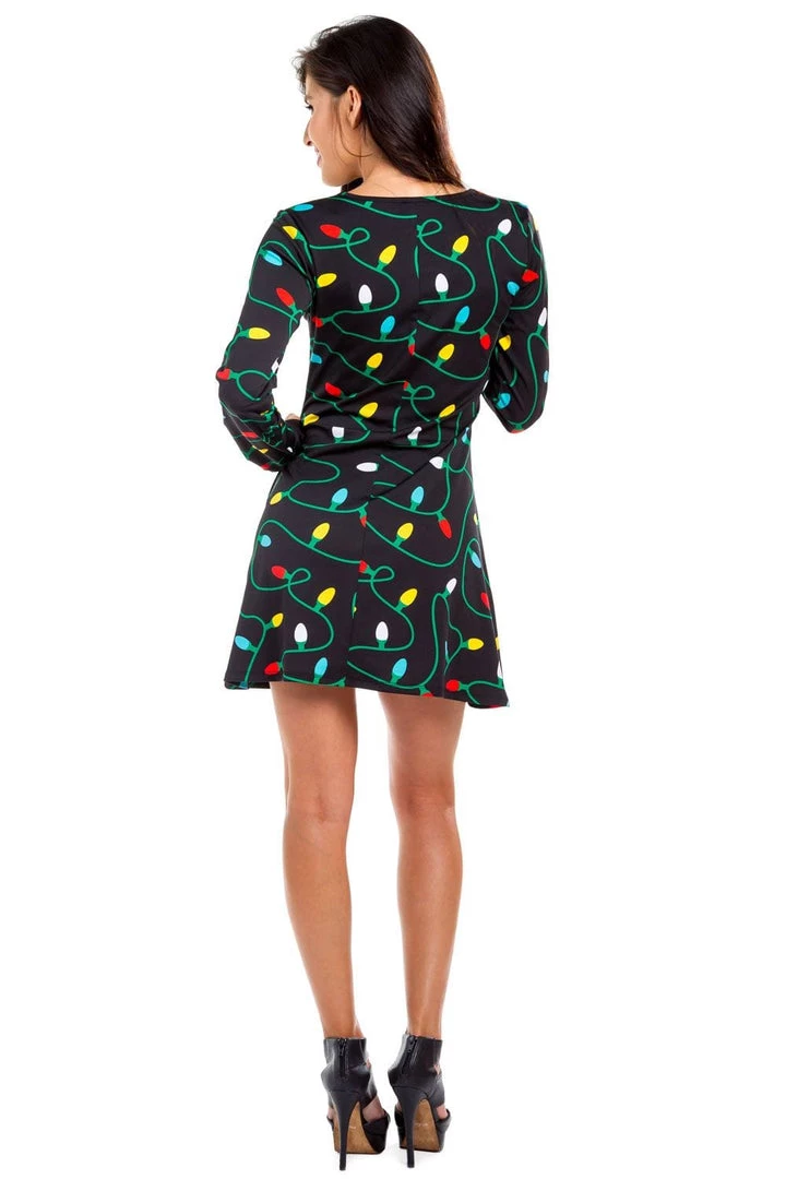 Ladies – love Christmas lights but hate high electricity bills? Be frugal this Christmas with your very own Twinkle Light Dress instead! This black Christmas lights sweater dress is both stylish and practical – it keeps you warm while you’re battling winter temperatures, but allows for enough movement if you want to take it onto the Christmas party dancefloor. With a selection of colors set against a dark background, this dress brings all that festive sparkle. There’s no sense in splashing out on a costume if you’re only going to wear it once – this year, be a bright spark and treat yourself with our Christmas lights sweater dress.